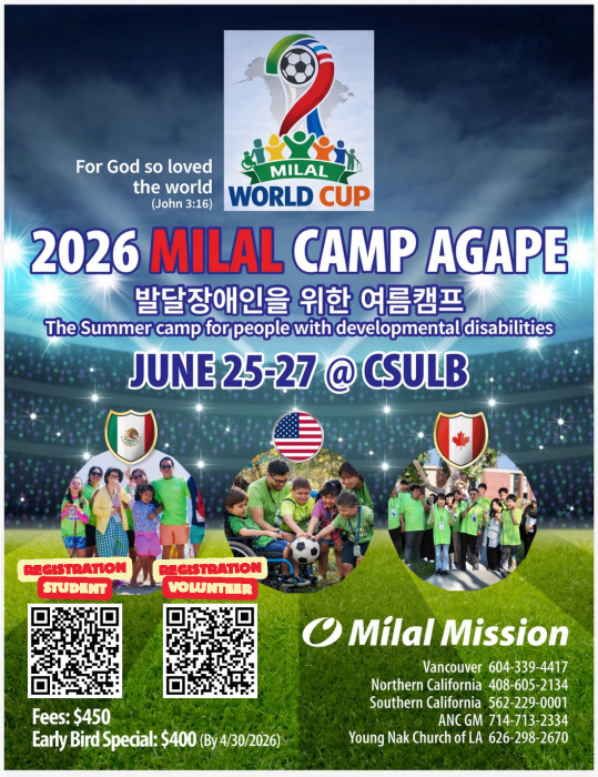 MILAL CAMP AGAPE 매년 6월, 발달장애 청소년, 중증 재가 장애인 및 시설 장애인을 대상으로 진행되는 사랑의캠프는 2박3일 동안 은혜로운 예배와 신나는 게임, 사랑이 충만한 교제를 통해 장애의 한계를 뛰어 넘어 ...